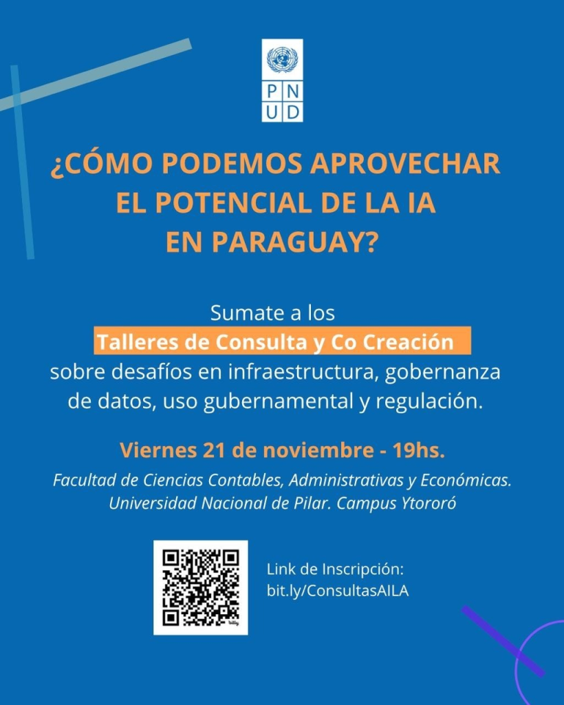 El Programa de las Naciones Unidas para el Desarrollo (PNUD), en alianza con MITIC y CONACYT, llega a Pilar con Talleres de Consulta y Co-Creación del AILA, una iniciativa que busca co-crear una hoja de ruta nacional para la adopción responsable, inclusiva y estratégica de la inteligencia artificial en Paraguay.