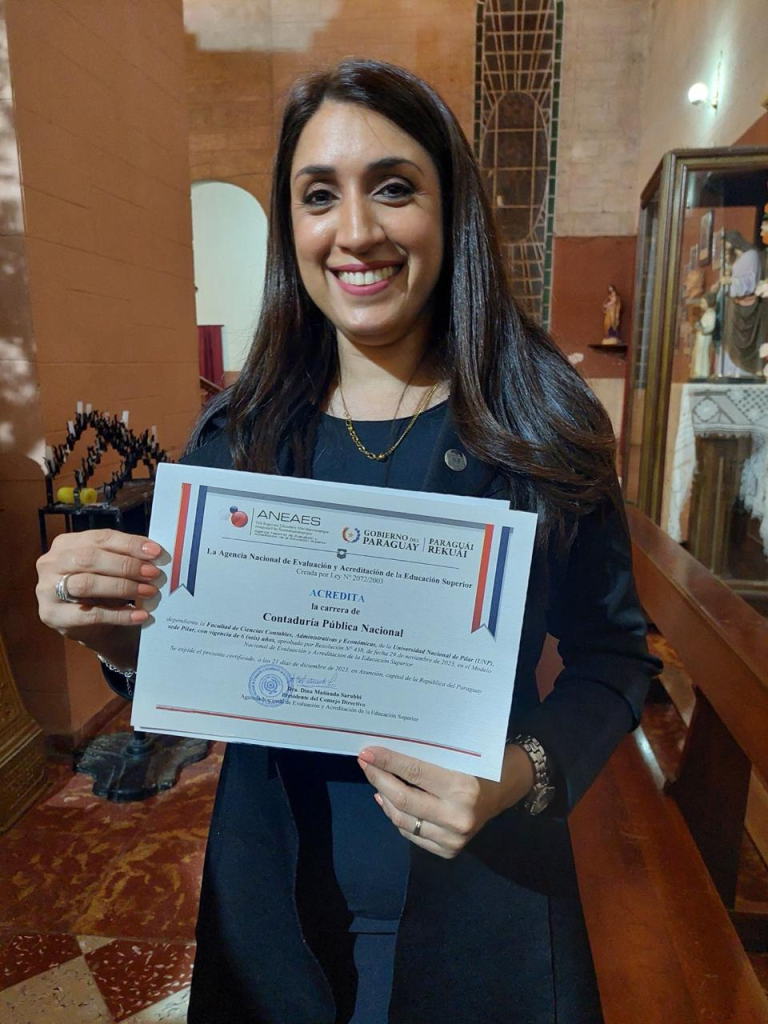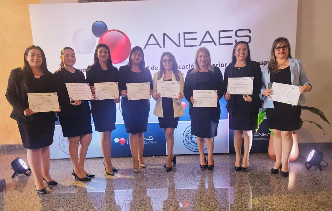 Recibieron la certificación los siguientes directivos: Dra. Petrona Fretes, Vicedecana; Dra. Laura Ozuna, Directora Académica; Lic. Liza Galeano, Coordinadora de Aseguramiento de la Calidad; Dra. Liliana Velazco, Coordinadora de Investigación; y Mgtr. Marlene Pineda, Coordinadora de Posgrado. ![]()